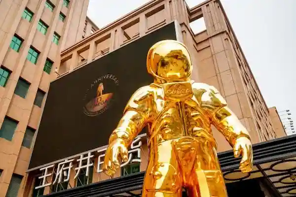 2019年7月16日,瑞士著名制表品牌欧米茄(OMEGA)于北京王府井盛大揭幕金色宇航员巨型雕塑展览。