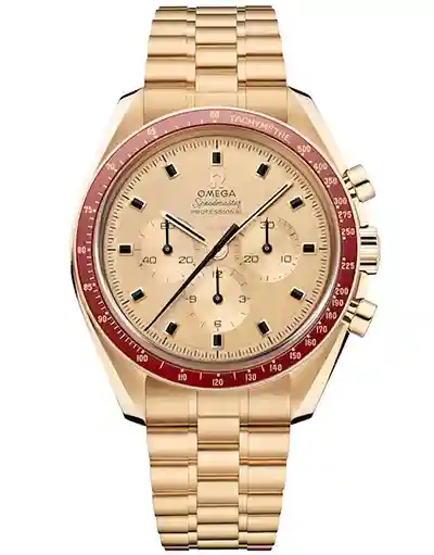 精钢款采用42毫米精钢表壳,表圈由Moonshine18K金打造而成,并经抛光处理,测速圈采用抛光黑色氧化锆(ZrO2)陶瓷,其测速刻度由OMEGACeragold®技术制成。全新腕表汲取人类首次登月历史作为设计灵感,融合现代创新材质,并搭载全新欧米茄3861手动上链至臻天文台机芯,配备同轴擒纵系统,具备停秒功能,采用欧米茄创新的防磁材质,其精准度、防磁性和整体性能均达到了至臻天文台认证所要求的行业更高标准。