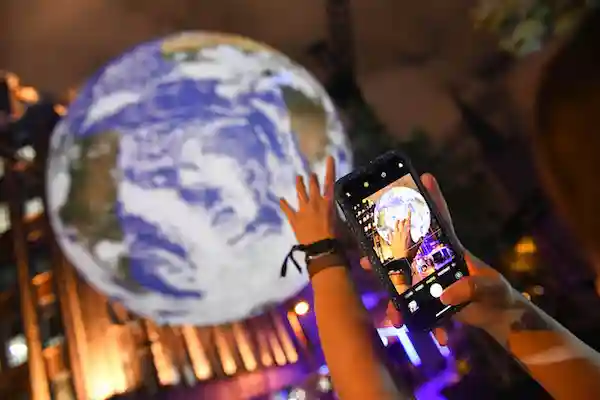 地球艺术装置GAIA,来自知名英国装置艺术家LukeJerram,作品名字取自希腊神话中的大地之神盖娅。巨大球体印有NASA拍摄的超高清地球表面影象图,直径长达7米,是真实地球180万分之一大小,每厘米的内部照明雕塑描绘了18公里的地球表面。令在场观众惊叹不已的是,如果身处球体的211米处,观众看到的蔚蓝星球,便是50年前,人类登月第一瞬间看到的地球模样。