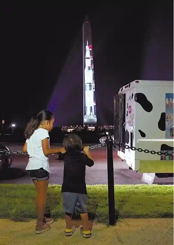 1969年执行登月任务的“土星5号”火箭的影像被投射到华盛顿纪念碑上。