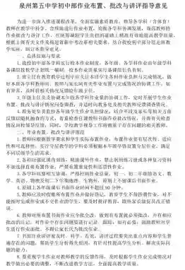 泉州五中所有文化学科实行校本作业制度,由年段学科备课组按教学计划统一编制。校本作业质量实行备课组长、教研组长双负责制;校本作业总量实行年段与备课组双线管理制度,备课组负责本学科每天校本作业量的控制,年段负责各班各学科书面作业时间总量的平衡与监控。