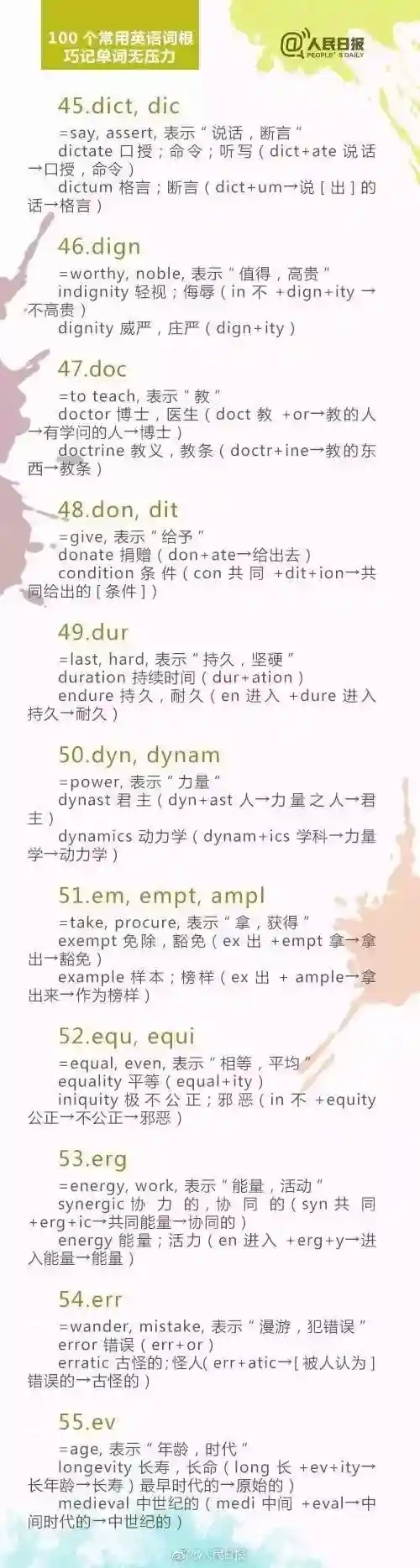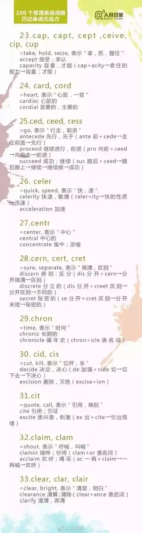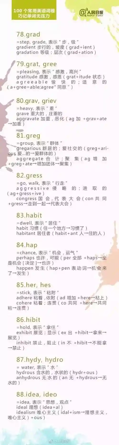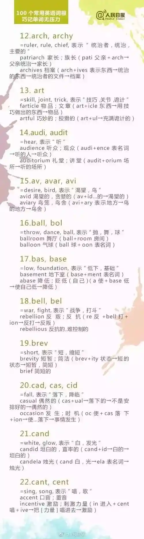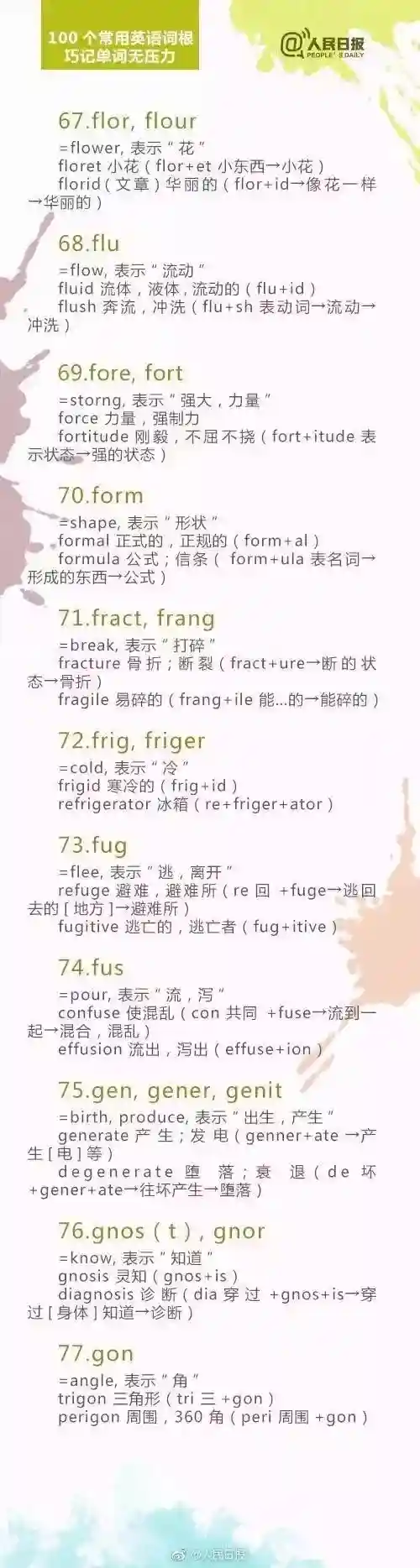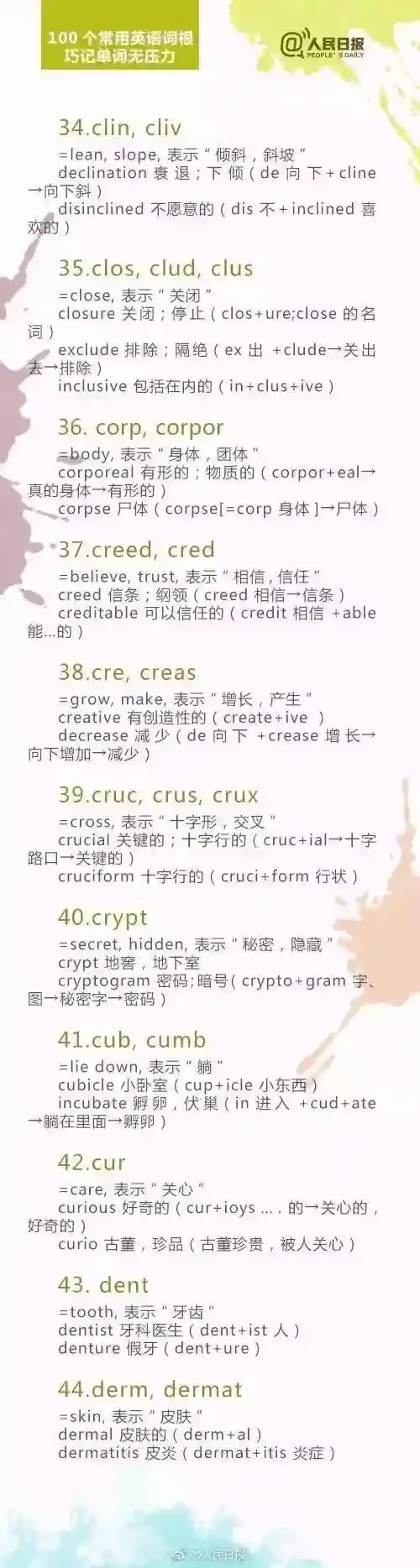 《》整理了100个英语词根↓↓各种英语考试都用得上。