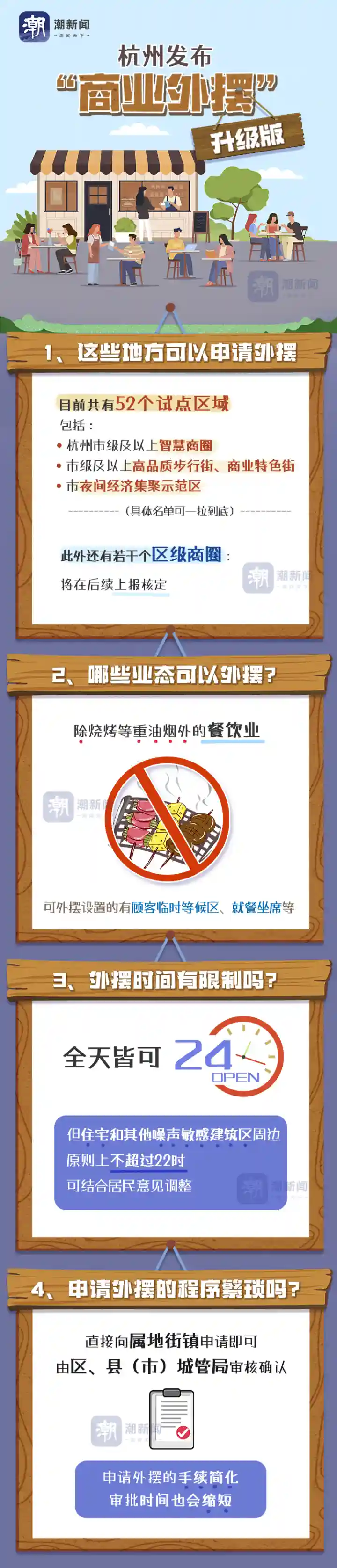 新政还规定了除烧烤等重油烟外的餐饮业,是杭州商业外摆的主要业态,并通过进一步放宽政策、下放权限、简化流程、创新方式,同时完善停车、保洁、执法配套服务等措施,加大对商业外摆、户外促销的支持力度。