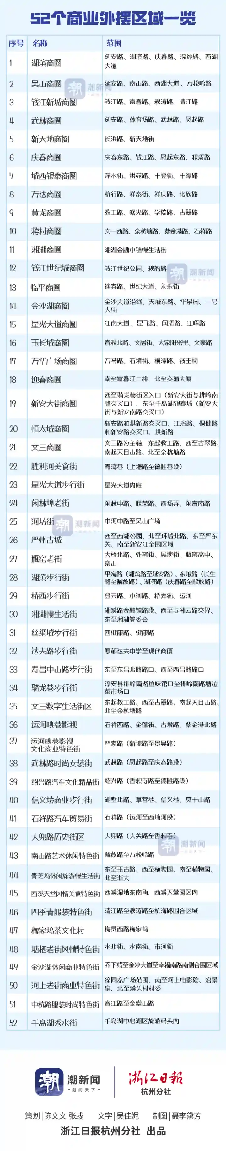根据新政,杭州市级及以上智慧商圈,市级及以上高品质步行街、商业特色街,以及市夜间经济集聚示范区,都可申请外摆区域,共52个,大家耳熟能详的武林商圈、湖滨商圈、河坊街、桥西步行街、胜利河美食街等,都在其中。此外,区、县(市)还将上报区级商圈进行核定。