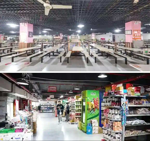 食堂规模巨大可容纳全校所有师生同时用餐,超市种类齐全各种零食生活用品应有尽有,全方位服务师生日常生活。