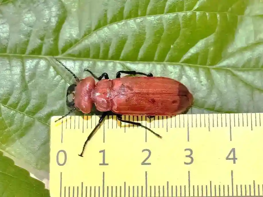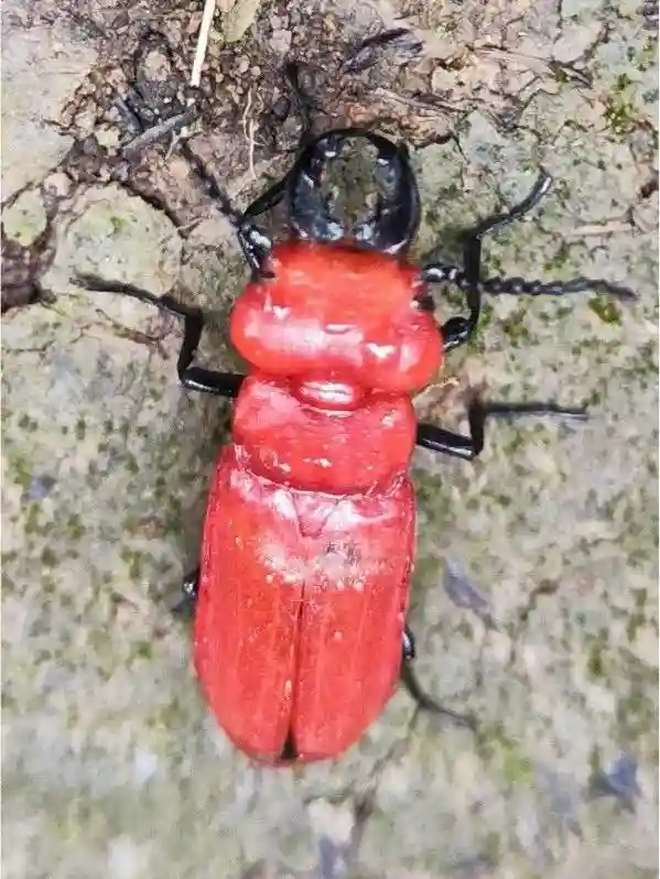 成虫体长18~30mm;体色全面鲜红色;具明显的大颚;雄虫大颚较雌虫发达,头部也较雌虫大;头、胸之间具颈,脚黑色。