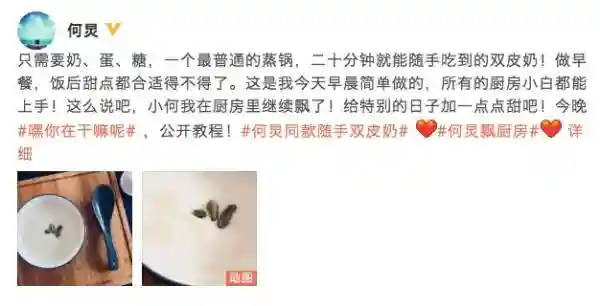 这位何大厨,先是把方便面开发出了“披萨”吃法,又用一招“酸奶蛋糕”带动了娱乐圈的自制蛋糕风潮,最后还用最简化的方法做出了诱人的双皮奶,俨然成为娱乐圈厨神担当。