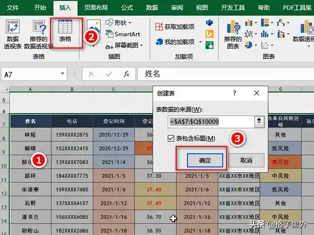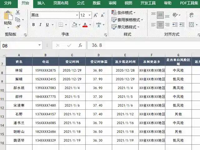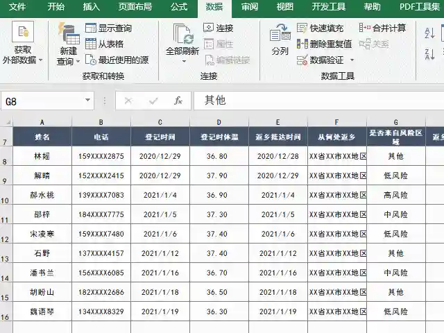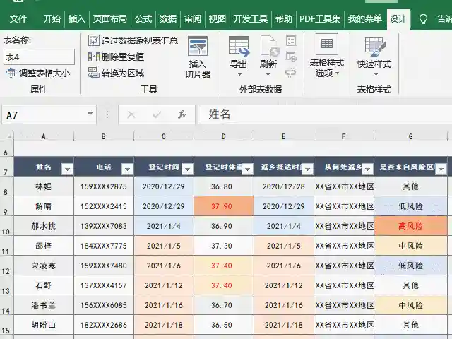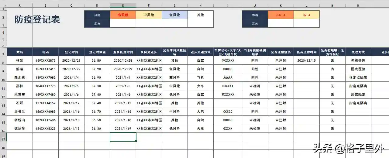 如图,先录入各种你关心的标题,如姓名、电话、登记时间、体温、返乡时间、是否从风险区域返乡、返乡方式、核酸检测结果等等,表头上方记得预留几行用于汇总数据和放置切片器哦。